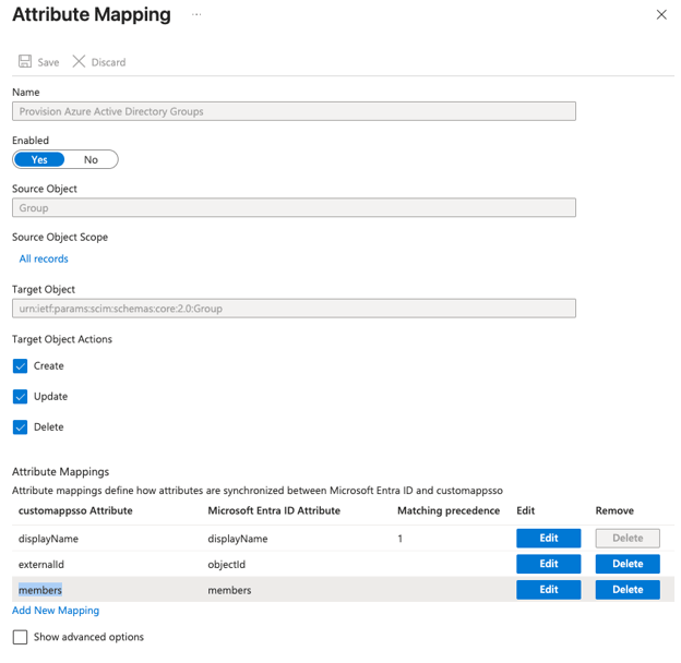 17. Click Provision Azure Active Directory Groups and delete attributes except the following three, and adjust them according to the schema
