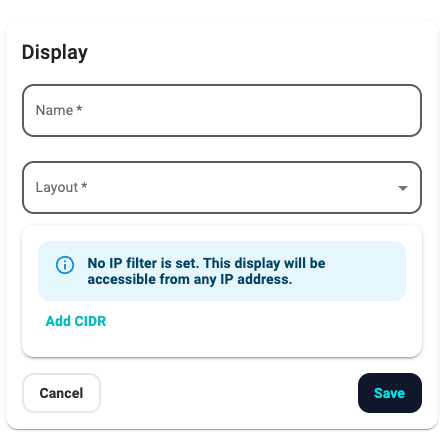 The final step in a Live View configuration is to publish the layout to a Display configuration. The Display configuration contains the public URL for the presentation and can optionally restrict access to specific IP addresses using a filtering rule.