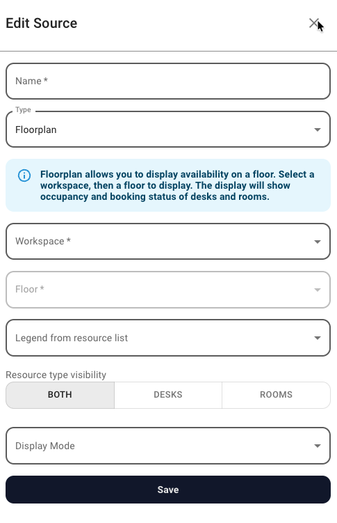 Next, you will add the floorplans as sources. For each floorplan source, you need to select the relevant workspace and floor. You also have the option to include Legends from the previously created Resource List Sources, as well as a Display Mode.