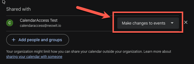 In order for Neowit to access the Google Calendar API of your Google Workspace organization, you need to grant us delegated access to a Service Account which in turn has Domain Wide Delegation access to the Google Calendar APIs.
